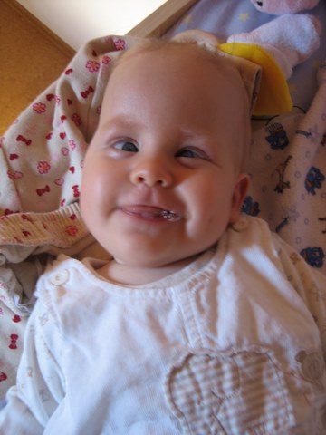 Jolina ist eine richtig kleine Strahlemaus, immer zufrieden und am Lachen. Sie kann mittlerweile sehr gut in Bauchlage stützen und spielt sogar manchmal aufm Bauch und sie beginnt ihre Beine zu bewegen.