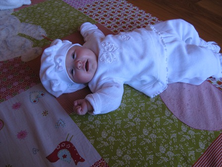 Romana ist seit 26.01. getauft und nach der Taufe kam ein riesen Entwicklungsschub. Sie ist ne richtig süße liebe kleine Quietschmaus und auch wenn man sie nicht sieht und nur hört, weiß man dass sie ein Mädchen ist weil sie sehr gerne vor sich hin gurrt und kreischt. Seit kurzem kann sie sich auch vom Rücken auf den Bauch drehen und findet die Position dann auch gar nicht mehr so schlecht.