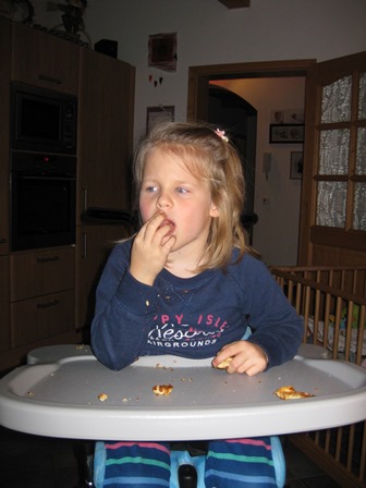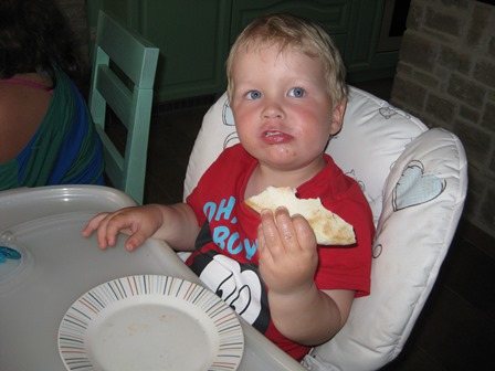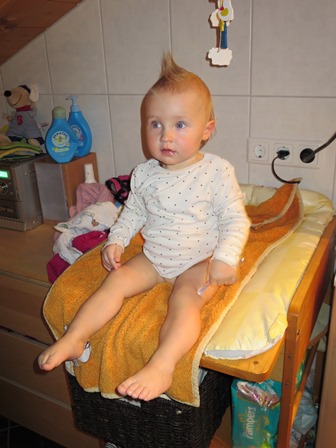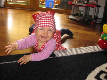 Mein Bruder Tamino isst für sein Leben gerne Breze und Pommes. Da hab ich mir gedacht, das muss ich doch auch mal wieder probieren und ich sags euch, das schmeckt gar nicht schlecht. Mama schimpft zwar immer, dass es danach aussieht wie im Schweinestall aber das auseinander bauen ist schließlich das Beste am Essen. Meine Breze besteht am Schluss aus 135 kleinen Teilen, die durch die Küche fliegen, ein paar davon landen in meinem Mund. Wenn ich was essen möchte sage ich immer Bei, Bei Bei. Ich kann jetzt auch andere neue Wörter ähää (ja), gake(Danke), geke(Schnecke), Babbi (Buffy), Mema (Oma), Gigagaga (Kindergarten). Mama hat mich ertappt, sie sagt ich versteh alles ( ich glaube das nicht, aber einige Dinge versteh ich wirklich). Wisst ihr, ich muss grad echt oft weinen, weil ich immer Sachen mache die ich nicht darf….aber ich kann nicht anders, ich muss einfach in der Küche die Schubladen ausräumen und die Sachen durch die Gegend schmeißen. Dann erschreck ich aber jedes Mal selber so sehr, dass ich ganz arg weinen muss. Und wenn man mich auf frischer Tat ertappt wenn ich etwas Verbotenes mache und man mich schimpft, dann noch mehr. Heute hat der Papa irgendwas gemacht, dass ich die Schubladen nicht mehr auf bekomme, dann hab ich mich einfach ganz lang gemacht und die obere Schublade ausgeräumt. Das war eh viel lustiger, denn da war mein Brei drin und den hab ich in der Küche verteilt :-). Bin mal gespannt was sich der Papa noch alles überlegt.