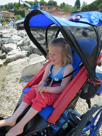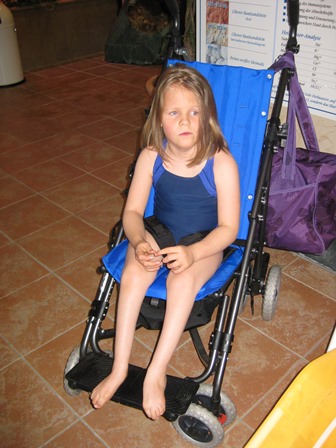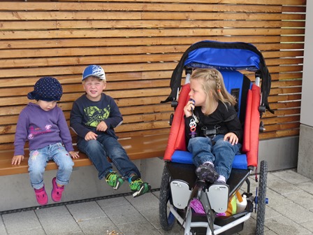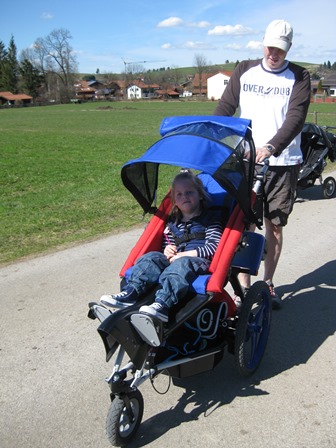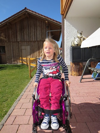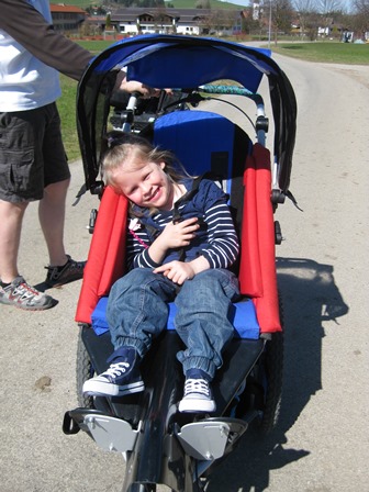Mama und Papa haben für mich wieder ganz schön in die Tasche gegriffen. Und ich sage DANKE. (Danke für die Spenden, ein Teil davon konnte vom Spendenkonto gezahlt werden). Mein neuer Rehawagen Kangoo ist suuuper toll und sehr bequem und ich kann überall mit hin. Über Stock und Stein und alle Schotterwege, ohne dass ich total durchgeschüttelt werde. Sogar Fahrrad fahren kann man damit. Die Krankenkasse war der Meinung ich brauch so was nicht, weil ich schon einen Rehabuggy Kimba hab (der gut ist, aber fürs Allgäu einfach nicht geeignet), aber Mama und Papa waren Gott sei Dank anderer Meinung. Eine neue Schaukel hab ich auch bekommen (Lekis), extra für so große besondere Kinder wie mich, das ist toll und schaukeln ist lustig.