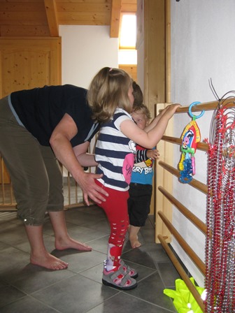 Jolina hat wieder angefangen sich hoch zu ziehen, sie hängt dann am Sofa dran und versucht mit Tamino und Romana den Sandmann anzuschauen. Sie steht zwar nicht auf Ihren Beinen, nutzt diese aber um sich abzustoßen und den Rest mach sie dann mit dem Oberkörper. Wenn sie aber Orthesen trägt und sie etwas zum festhalten hat, gelingt es ihr immer mal wieder längere Zeit mit wenig Unterstützung zu stehn.