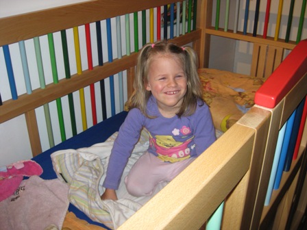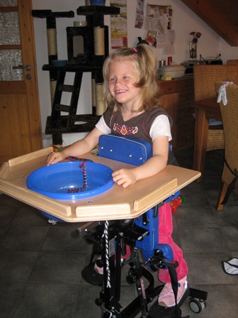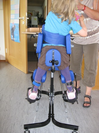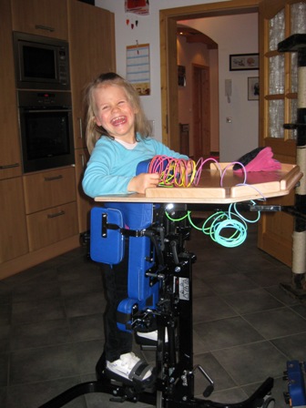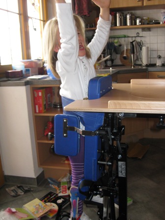 Der Stehständer ist nun auch endlich da und es gefällt ihr echt gut darin. Das Anschnallen ist zwar nicht so ihre Sache, aber sie zeigt schon wie groß sie da drin ist. Jolinas Pflegebett ist auch schon im Anflug.