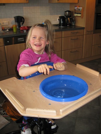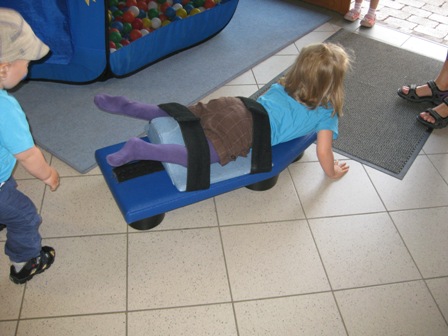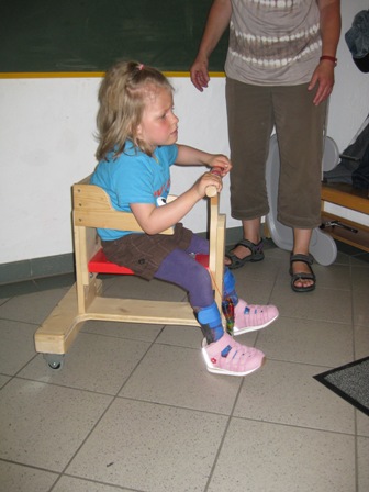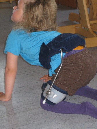 Noch immer sind die Planungen mit der Aufzugsanlage am Laufen. Anträge müssen genehmigt werden, Stiftungen müssen unsere Anträge bearbeiten um uns HOFFENTLICH unterstützen zu können und wir müssen lernen sehr viel Geduld zu haben. Jolina geht’s momentan sehr gut, sie macht gerade wieder einen Schub. Zum einen hat sie den Fernseher entdeckt, wo sie sich gern mal 2-3Minuten davor setzt und wirklich rein schaut, wenn Tamino seine Lieblingssendung, Kikaninchen schaut. Zum anderen fängt sie an, immer mehr nachzuplappern. Unsere Sprache ist ihr wohl zu schwierig, aber die von Tamino kann sie schon ganz gut. Leider kam beim Hüftröntgen im Mai kein besonders schönes Ergebnis heraus. Die Hüfte hat sich deutlich verschlechtert. Die Hüftknochen sind schon 3/4 aus der Hüftpfanne draußen. Das kommt daher, weil Jolina immer im Zwischenfersensitz am Boden hockt, weil sie nicht steht und geht und durch die Spastik in ihren Beinen. Jetzt ist es wichtig zu schauen, dass die Hüfte nicht ganz luxiert. Deshalb müssen wir darauf achten, dass sie die Beine so oft wie möglich auseinander bringt. Im Stehständer steht sie in Abduktion, dann haben wir einen Hochstuhl mit Keil zwischen den Beinen, das Rollbrett wie auf dem Foto zu sehen und eine Swashorthese. All dies hilft hoffentlich damit es nicht schlimmer wird. Wir waren auch beim Reiten, aber Jolina fällt es sehr schwer auf dem Pferd zu sitzen, weil sie ihre Beine schon gar nicht mehr auseinander bringt. Bei der Kinderorthopädiesprechstunde wurde uns der Vorschlag gemacht, ihr Botox zu spritzen. Botox ist ein Nervengift, welches gerade bei starker Spastik oft angewandt wird, es soll die Muskeln lähmen, damit die Beine sich etwas entspannen. Die Wirkung ist von Fall zu Fall unterschiedlich, lässt aber im Regelfall nach 3 Monaten nach. Das müssen wir uns aber erst noch gründlich überlegen und warten im Moment eh noch auf einen Beratungstermin.