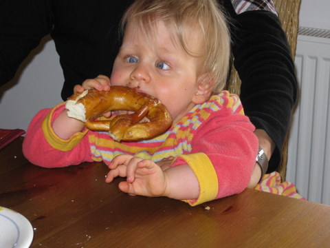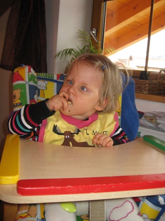 Jolina versucht ganz viele verschiedene Dinge zu Essen, sie muss alles erst mit den Händen ertasten und 10mal umdrehen und dann wird’s in den Mund gesteckt, Keckse allerlei sind lecker, mit Milchschnitte und Essiggurke kann sie sich aber nicht anfreunden.