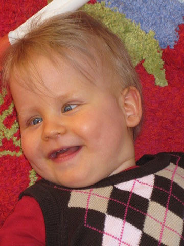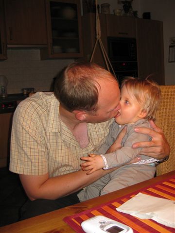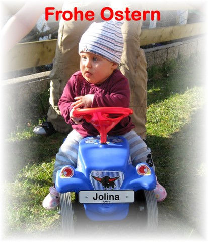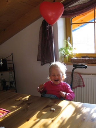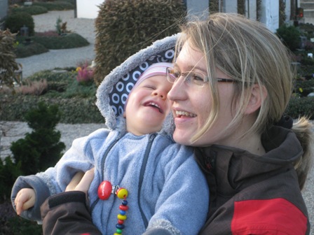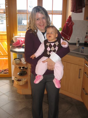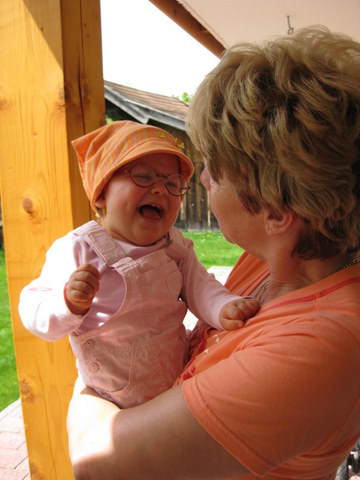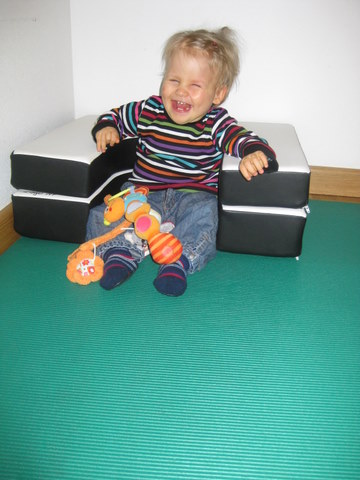 Jolina geht es weiterhin sehr gut, sie macht gerade tolle Fortschritte. Wir haben das Gefühl, dass Jolina immer mehr versteht wenn man z.B. zu ihr sagt, daß man ein Bussi möchte bekommt man das auch. Sie kann auch Eia machen(streicheln), das sagt sie dann auch, sie macht sowieso ziemlich viele Laute nach, das Miauen unsrer Katze oder wenn jemand hustet, muss sie das auch, nur am Sprechen scheiterts noch. Sie hat letzte Woche auch endlich ihre Beine entdeckt und fasst sich jetzt ständig an die Knie und zieht sie hoch. Wenn sie hochgenommen werden will streckt sie ihre Arme aus. Und sie entwickelt immer mehr ihren eigenen Kopf, was für uns zwar erfreulich nur leider nicht immer von Vorteil ist. Sie sortiert z.B. grad sehr viel von meinem Speiseplan aus. Leider hat sie auch eine ganz blöde neue Macke, wenn ihr irgendwas nicht passt, donnert sie sich mit voller Wucht ihre Faust auf den Kopf, alle Versuche sie davon abzuhalten, gingen in die Hose. Am besten ist, sie in eine andere Situation zu bringen und wenn das halt gerade nicht geht, beispielsweise beim Essen, hilft nur ignorieren.