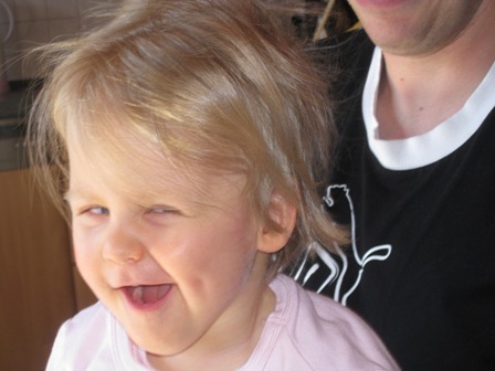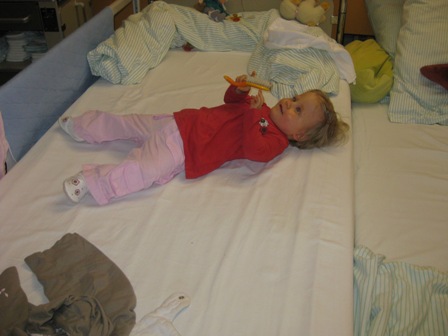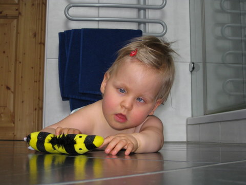 Jolina hat wieder ziemliche Probleme mit dem Schlafen. Wir vermuten, dass sie Zähne bekommt. Es könnte auch sein, dass sie einfach wahnsinnige Spannungen hat, denn sie knirscht auch mit den Zähnen, außerdem haut sie sich immer mit der linken Hand auf den Kopf.