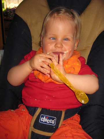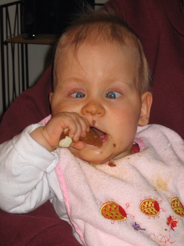 Unsere kleine Kotzgurke hats mal wieder geschafft, dass Mama mit waschen nicht mehr nachkommt. Naja alles ist halt nun mal nicht feinpüriert aber wenn sie es nicht ausprobieren darf, wird sie nie lernen etwas Richtiges zu Essen. Manchmal klappts ganz gut, da kommt es vor dass sie ganz fein isst und manchmal(leider meistens) muss sie danach baden, oder Mama (hi,hi).
