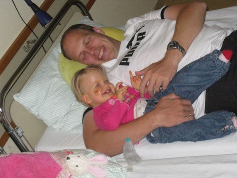 Gegen Abend stieg das Fieber und sie bekam ein Zäpfchen und ich legte sie ins Bett. Sie hat nicht sehr lange geschlafen dann wurde sie sehr unruhig. Ich nahm sie auf meinen Arm damit sie sich beruhigte. Sie hatte den Schnuller im Mund und dann erbrochen, dann begann das Drama. Durch die Nase hat sie dann das Erbrochene wieder eingeatmet. Sie konnte irgendwann gar nicht mehr atmen war dann total blau und hat die Augen verdreht, ich hab alles mögliche versucht sie zum Atmen zu bringen, ich dachte ehrlich sie stirbt mir, bis ich ihr dann meinen Finger in den Hals steckte, dann erbrach sie sich nochmal. Danach konnte sie wenigstens wieder atmen aber immer noch sehr schlecht. Ich dachte mir wenn ich sie zum schreien bring dann hustet sie den Rest raus, deshalb gab ich ihr kaltes Wasser ins Gesicht, aber das half auch nichts. Sie hechelte nur ganz hektisch. Gott sei Dank waren meine Schwiegereltern im Haus, die hab ich dann angerufen, meine Schwiegermutter kam sehr schnell hoch, ich hab dann erstmal meinem halbblauen Kind die nassen Klamotten ausgezogen und Fieber gemessen. 39,6°C, dann hab ich meinen Mann angerufen, der war dann auch sehr schnell da. Meine Schwiegermama alarmierte dann den Notarzt und noch während sie telefonierte begann Jolina zu krampfen. Wir haben sie an den Monitor gehängt und da hat sich dann bestätigt dass sie sehr schlecht gesättigt war. Wir dachten wir könnten sie bebeuteln, aber das ging nicht. Endlich dann war der Notarzt da, gab ihr erstmal Diazepan, hat sie abgesaugt und gab ihr Sauerstoff. Dann fuhren wir ins Krankenhaus, irgendwie hat das Medikament nur leider nicht lange gewirkt. Jolina krampfte im Krankenwagen wieder. In Kempten angekommen, haben sie ihr dann gleich Luminal gespritzt. Dann war sie so platt, dass sie 2 Stunden lang immer wieder zu atmen aufhörte und stimuliert werden musste. Es folgten Untersuchungen von Blut und Likor, das war eine lange Zeit des Wartens. Ich hatte Angst, dass es wieder eine Shuntinfektion ist. Aber Gottdeidank! Likor ist ok.