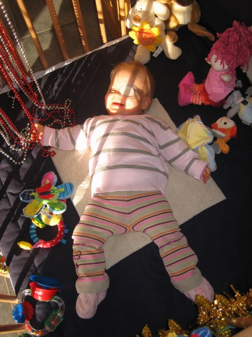 16.11.09 Jolina hat sich heute zum ersten Mal über die rechte Seite von Rücken auf Bauch gedreht. Wir sind sooo stolz auf unser Mausi (-; Und wenn sich Mama nicht getäuscht hat ist Jolina heute ein Baba rausgerutscht. Und gewachsen ist sie auch: 79cm und 9,4 kg.
