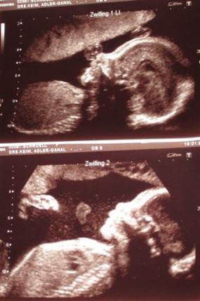 Mensch war das aufregend es ist schon eine Fruchthülle zu sehen. Die große Überraschung kam dann 2Wochen später, ich war wegen Blutungen beim Frauenarzt. Ich dachte schon jetzt ist alles vorbei, aber ganz im Gegenteil, es schlagen zwei Herzchen: ZWILLINGE.